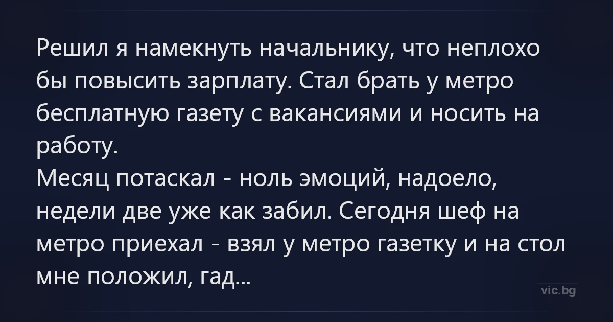 Решил я намекнуть начальнику, что неплохо бы повысить зарплату. Стал брать у метро бесплатную газету с вакансиями и носить на работу.