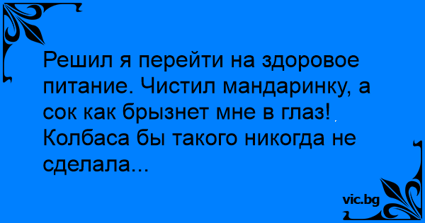 Решил я перейти на здоровое питание. Чистил мандаринку, а сок как брызнет мне в глаз! Колбаса бы такого никогда не сделала...