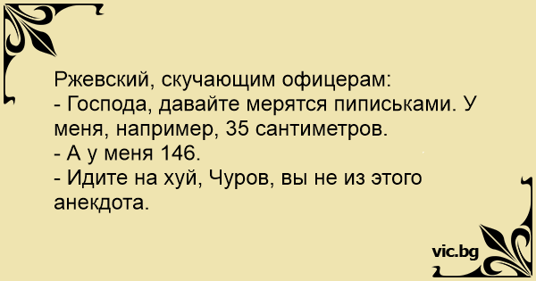 - Господа, давайте мерятся пиписьками. У меня, например, 35 сантиметров.