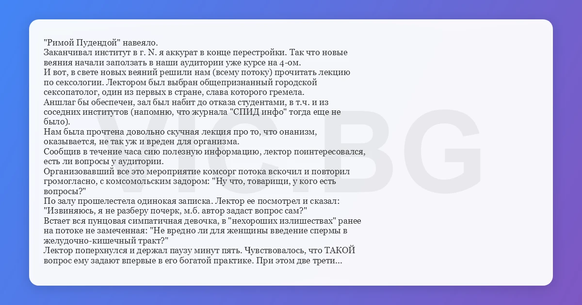 "Римой Пудендой" навеяло. Заканчивал институт в г. N. я аккурат в конце перестройки. Так что новые веяния начали заползать в наши аудитории уже курсе на 4-ом. И вот, в свете новых веяний решили нам (всему потоку) прочитать лекцию по сексологии. Лектором был выбран общепризнанный городской сексопатолог, один из первых в стране, слава которого гремела. Аншлаг бы обеспечен, зал был набит до отказа студентами, в т.ч. и из соседних институтов (напомню, что журнала "СПИД инфо" тогда еще не было). Нам была прочтена довольно скучная лекция про то, что онанизм, оказывается, не так уж и вреден для организма. Сообщив в течение часа сию полезную информацию, лектор поинтересовался, есть ли вопросы у аудитории. Организовавший все это мероприятие комсорг потока вскочил и повторил громогласно, с комсомольским задором: "Ну что, товарищи, у кого есть вопросы?" По залу прошелестела одинокая записка. Лектор ее посмотрел и сказал: "Извиняюсь, я не разберу почерк, м.б. автор задаст вопрос сам?" Встает вся пунцовая симпатичная девочка, в "нехороших излишествах" ранее на потоке не замеченная: "Не вредно ли для женщины введение спермы в желудочно-кишечный тракт?" Лектор поперхнулся и держал паузу минут пять. Чувствовалось, что ТАКОЙ вопрос ему задают впервые в его богатой практике. При этом две трети зала легло на столы лицами вниз и начало судорожно извиваться - молча! Ответ сексопатолога был достойный: "Если только у женщины нет аллергии на сперму мужа, особого вреда нет".