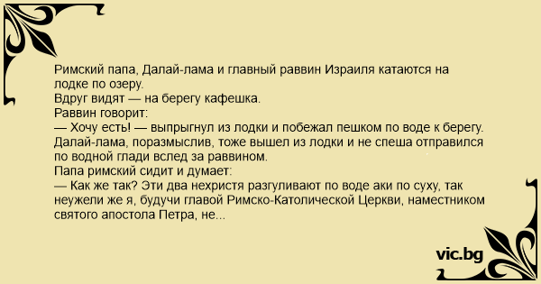 Римский папа, Далай-лама и главный раввин Израиля катаются на лодке по озеру. Вдруг видят — на берегу кафешка. Раввин говорит: — Хочу есть! — выпрыгнул из лодки и побежал пешком по воде к берегу. Далай-лама, поразмыслив, тоже вышел из лодки и не спеша отправился по водной глади вслед за раввином. Папа римский сидит и думает: — Как же так? Эти два нехристя разгуливают по воде аки по суху, так неужели же я, будучи главой Римско-Католической Церкви, наместником святого апостола Петра, не смогу повторить тоже самое? Сказано — сделано: ступил папа римский за борт лодки: ну, и начал тонуть. Раввин смотрит с берега на бултыхания римского папы и говорит, обращаясь к Далай-ламе: — Наверное-таки надо было ему сказать про деревянные столбики под водой? — Какие столбики? — удивился Далай-лама.