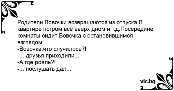 Родители Вовочки возвращаются из отпуска.В квартире погром,все вверх дном и т.д.Посередине комнаты сидит Вовочка с остановившимся взглядом.