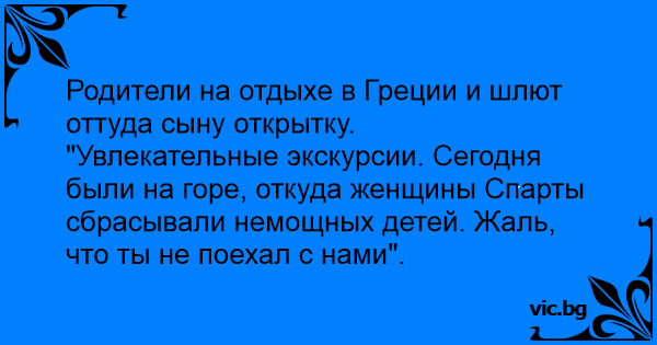 "Увлекательные экскурсии. Сегодня были на горе, откуда женщины Спарты сбрасывали немощных детей. Жаль, что ты не поехал с нами".