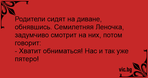 Родители сидят на диване, обнявшись. Семилетняя Леночка, задумчиво смотрит на них, потом говорит: