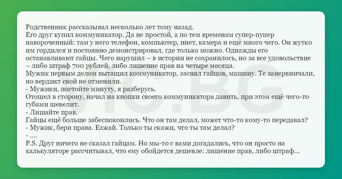 P.S. Друг ничего не сказал гайцам. Но мы-то с вами догадались, что он просто на калькуляторе рассчитывал, что ему обойдется дешевле: лишение прав, либо штраф...