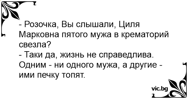 - Таки да, жизнь не справедлива. Одним - ни одного мужа, а другие - ими печку топят.