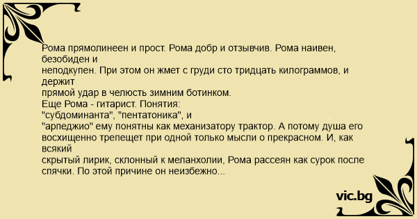 Рома прямолинеен и прост. Рома добр и отзывчив. Рома наивен, безобиден и неподкупен. При этом он жмет с груди сто тридцать килограммов, и держит прямой удар в челюсть зимним ботинком. Еще Рома - гитарист. Понятия: