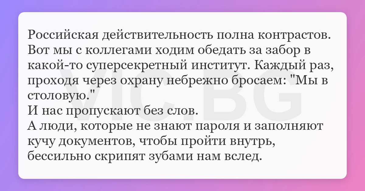 Вот мы с коллегами ходим обедать за забор в какой-то суперсекретный институт. Каждый раз, проходя через охрану небрежно бросаем: "Мы в столовую."