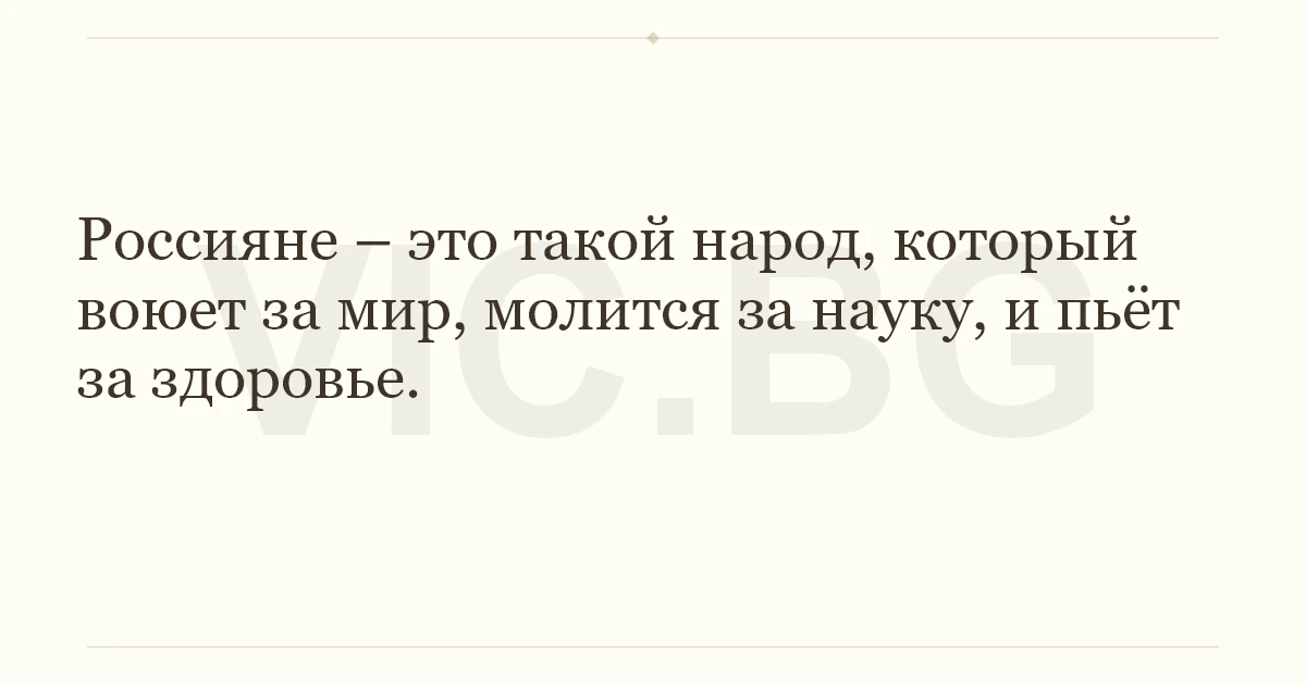Россияне – это такой народ, который воюет за мир, молится за науку, и пьёт за здоровье.