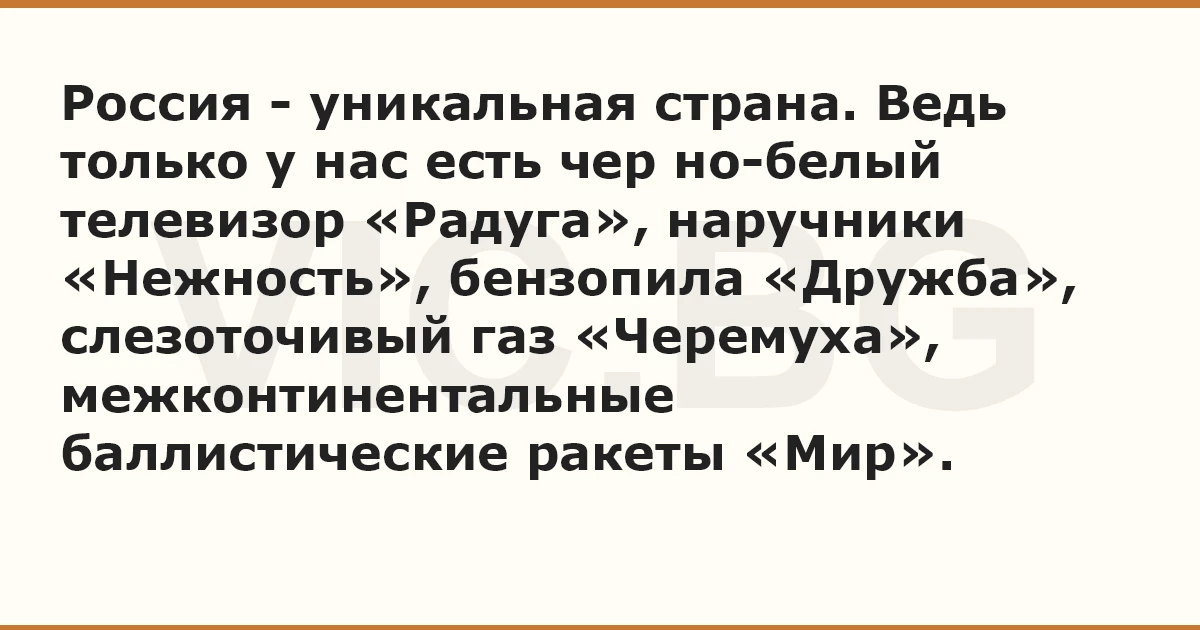 Россия - уникальная страна. Ведь только у нас есть чер но-белый телевизор «Радуга», наручники «Нежность», бензопила «Дружба», слезоточивый газ «Черемуха», межконтинентальные баллистические ракеты «Мир».