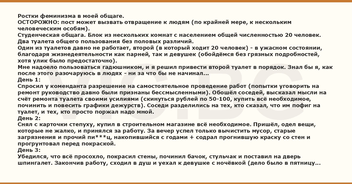 Ростки феминизма в моей общаге. ОСТОРОЖНО: пост может вызвать отвращение к людям (по крайней мере, к нескольким человеческим особям). Студенческая общага. Блок из нескольких комнат с населением общей численностью 20 человек. Два туалета общего пользования без половых различий. Один из туалетов давно не работает, второй (в который ходит 20 человек) - в ужасном состоянии, благодаря жизнедеятельности как парней, так и девушек (обойдёмся без грязных подробностей, хотя улик было предостаточно). Мне надоело пользоваться гадюшником, и я решил привести второй туалет в порядок. Знал бы я, как после этого разочаруюсь в людях - ни за что бы не начинал... День 1: Спросил у коменданта разрешение на самостоятельное проведение работ (попытки уговорить на ремонт руководство давно были признаны бессмысленными). Обошёл соседей, высказал мысли на счёт ремонта туалета своими усилиями (скинуться рублей по 50-100, купить всё необходимое, починить и повесить графики дежурств). Соседи разделились на тех, кто сказал, что им пофиг на туалет, и тех, кто просто поржал надо мной. День 2: Снял с карточки степуху, купил в строительном магазине всё необходимое. Пришёл, одел вещи, которые не жалко, и принялся за работу. За вечер успел только вычистить мусор, старые загрязнения и прочий пи***ц, накопившийся с годами + содрал прогнившую краску со стен и прогрунтовал перед покраской. День 3: Убедился, что всё просохло, покрасил стены, починил бачок, стульчак и поставил на дверь шпингалет. Закончив работу, сходил в душ и уехал к девушке с ночёвкой (дело было в пятницу вечером). День 4: Не был в общаге. День 5: Приехал обратно в воскресенье вечером, пошёл в туалет и вижу картину: на двери того туалета, который я починил, появилась нарисованная маркером большая буква Ж и неумело прикрученные петли с маленьким замком. На двери гадюшника тем же маркером нарисована буква М (замка на двери нет). Слегка при**ев от такого поворота, прошёлся ко комнатам, попросил всех жильцов выйти в коридор на собрание, на котором поднял вопрос, какого, собственно, хуй здесь происходит?! Ответ буквально перевернул моё представление о людях, которых я знал уже несколько лет: - ну это теперь женский туалет - это с какой стати? - ну мы так решили - кто это "мы"? - девочки (8 из 20 жителей блока) - а с какой стати вы это решили? кто вам дал такое право? - ну потому что мы девочки! мы не собираемся ходить в один туалет с вами свиньями, вы постоянно бла-бла-бла... И тут понеслось: в следующие несколько минут "девочки" из приличного ВУЗа буквально на глазах превращались в каких-то злобных гопниц (маты, оскорбления, грязь). Я просто стоял и ох**вал: мы же с вами знакомы не первый год, мы же вместе живём, вместе учимся - откуда в вас столько дерьма, откуда вся эта ненависть? Послушав тирады о том, какие "все мужики" свиньи и мрази, некоторые не выдержали и вступили с хабалками в спор. Справедливости ради скажу, что некоторые парни тоже повели себя весьма мерзко, заявив, например, что кто-то из них должен пользоваться новым толчком, потому что он старшекурсник или потому что лично он "никогда не ссал мимо унитаза". Нашлись даже "рыцари", которые встали на защиту девчонок (парень одной из них и чувак, который был влюблён в другую). Первые минут 5 я пытался спорить, потом просто стоял с открытым ртом, а в голове крутилось "какое же вы стадо...". В итоге мне стало н