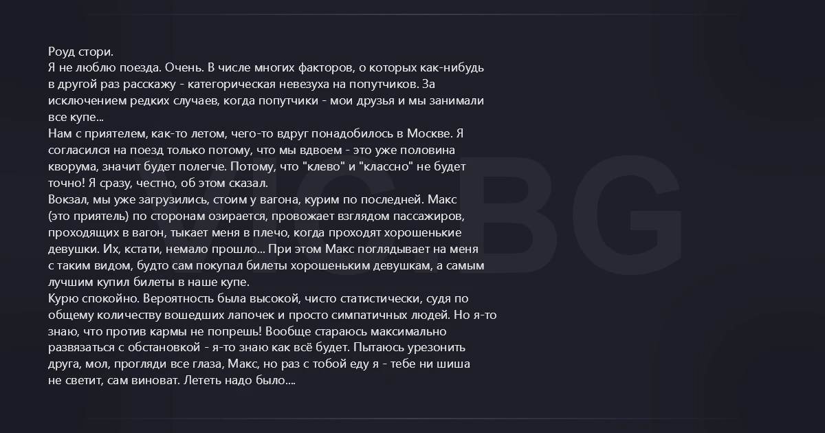 Роуд стори. Я не люблю поезда. Очень. В числе многих факторов, о которых как-нибудь в другой раз расскажу - категорическая невезуха на попутчиков. За исключением редких случаев, когда попутчики - мои друзья и мы занимали все купе... Нам с приятелем, как-то летом, чего-то вдруг понадобилось в Москве. Я согласился на поезд только потому, что мы вдвоем - это уже половина кворума, значит будет полегче. Потому, что "клево" и "классно" не будет точно! Я сразу, честно, об этом сказал. Вокзал, мы уже загрузились, стоим у вагона, курим по последней. Макс (это приятель) по сторонам озирается, провожает взглядом пассажиров, проходящих в вагон, тыкает меня в плечо, когда проходят хорошенькие девушки. Их, кстати, немало прошло... При этом Макс поглядывает на меня с таким видом, будто сам покупал билеты хорошеньким девушкам, а самым лучшим купил билеты в наше купе. Курю спокойно. Вероятность была высокой, чисто статистически, судя по общему количеству вошедших лапочек и просто симпатичных людей. Но я-то знаю, что против кармы не попрешь! Вообще стараюсь максимально развязаться с обстановкой - я-то знаю как всё будет. Пытаюсь урезонить друга, мол, прогляди все глаза, Макс, но раз с тобой еду я - тебе ни шиша не светит, сам виноват. Лететь надо было. В этот момент Макс треснул меня в плечо особенно сильно и кивнул на вагонное окно. Я глянул и увидел, как две подозрительно очаровательные девушки, глянув на цифры на купе, решительно потянули дверь. Засиявшая торжеством рожа Макса заставила меня приободриться. В оставшиеся десять минут до отхода мы сбегали за "у нас тут стучайно" коньяком, фруктами и шоколадом. Влетели в вагон под неодобрительным взглядом проводницы. В коридоре, нос к носу повстречались с "нашими" девушками, которые шли нам навстречу, следовательно - выходили. А и нашего купе им вслед смотрели две бабки "с лавочки" лет ста сорока на двоих. Одновременно бабки окинули нас недовольными, надменными, брюзгливыми, осуждающими и тд. взглядами. Собственно, моя психика не пострадала - я вновь убедился в том, что мир стабилен. Девочки провожали бабушек, разместили их "согласно купленных билетов" и отправились по своим делам. А бабушки подтянулись как раз, когда мы обеспечивали фуражный обоз. На Макса было жалко смотреть. Поезд тронулся. Путешествие началось. Бабульки не выказывали никаких намерений к добрососедскому сосуществованию. Даже наоборот. Одна из них настойчиво истребовала от Макса поменяться с ней местами (ее верх на максов низ). Настояли на закрытии форточки, пытались послать нас за чаем к проводнице... Мы удрали в вагон-ресторан, а по возвращении залезли на свои антресольки и там мрачно, и уверенно, шепотом напились до невозможности. Ночью бабки по нескольку раз, кряхтя и причитая, шлепали в туалет, при этом хлопали дверью. Между походами храпели в два голоса. Утром смотрели на нас так, будто мы вчера, на их глазах склоняли их внучек к грязному сожительству. Макс потом на меня дулся за что-то. Таки карма - страшная сила.