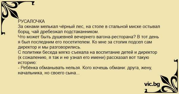 РУСАЛОЧКА За окнами мелькал чёрный лес, на столе в стальной миске остывал борщ, чай дребезжал подстаканником.