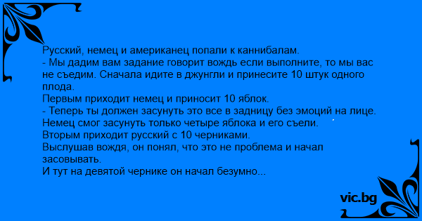 - Теперь ты должен засунуть это все в задницу без эмоций на лице. Немец смог засунуть только четыре яблока и его съели.