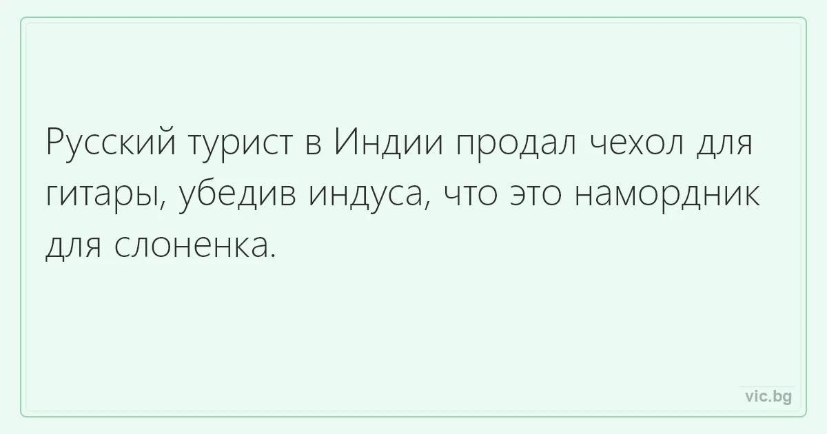 Русский турист в Индии продал чехол для гитары, убедив индуса, что это намордник для слоненка. 13 0 0
