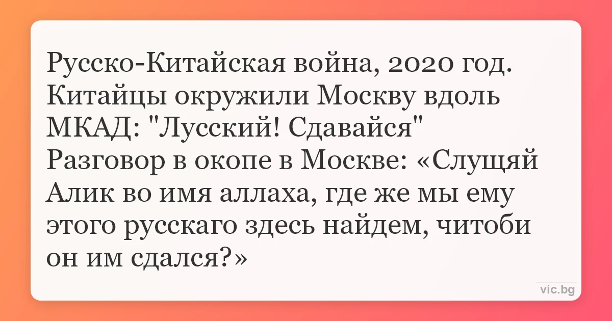 Русско-Китайская война, 2020 год.<br />Китайцы окружили Москву вдоль МКАД: "Лусский! Сдавайся"<br />Разговор в окопе в Москве: «Слущяй Алик во имя аллаха, где же мы ему этого русскаго здесь найдем, читоби он им сдался?»