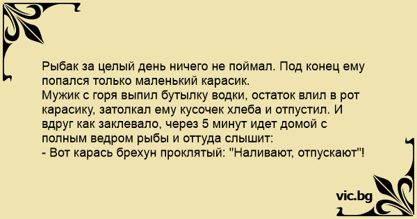 Мужик с горя выпил бутылку водки, остаток влил в рот карасику, затолкал ему кусочек хлеба и отпустил. И вдруг как заклевало, через 5 минут идет домой с полным ведром рыбы и оттуда слышит:
