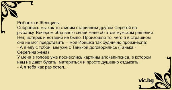Собрались мы как-то с моим старинным другом Серегой на рыбалку. Вечером объявляю своей жене об этом мужском решении. Нет, истерик и нотаций не было. Произошло то, чего я в страшном сне не мог представить -- моя Иришка так буднично произнесла: