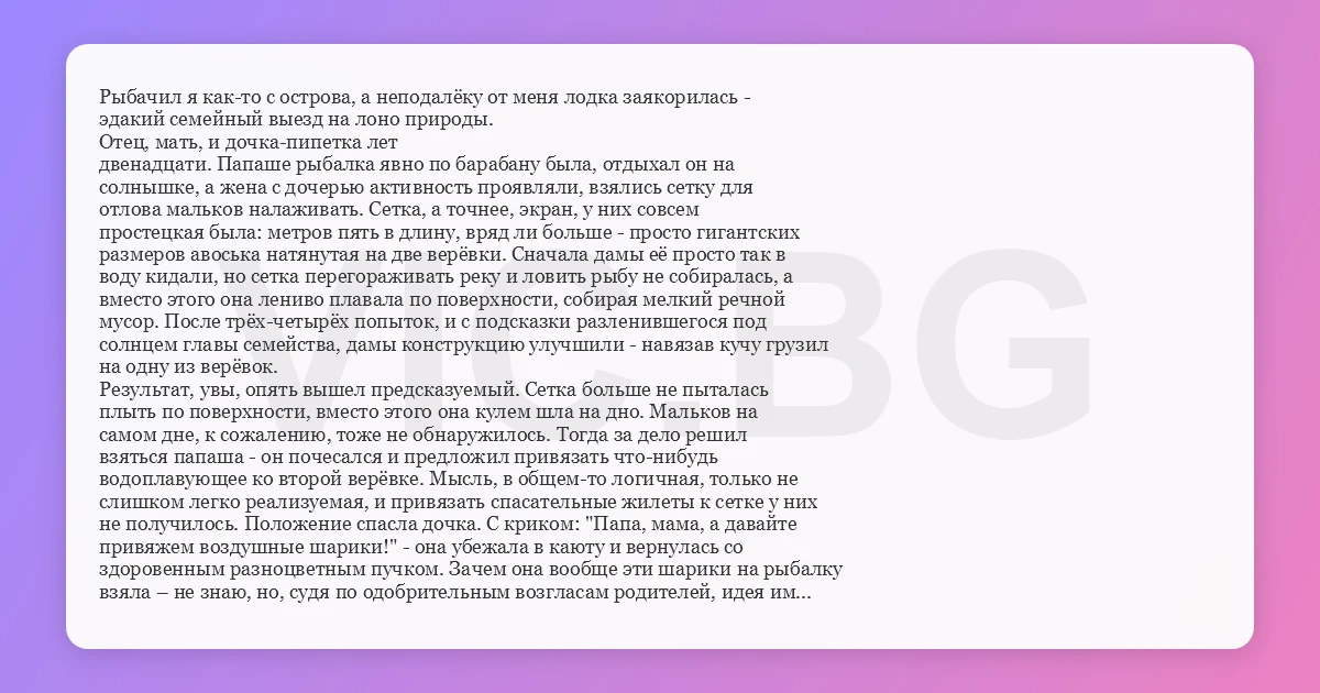 Рыбачил я как-то с острова, а неподалёку от меня лодка заякорилась - эдакий семейный выезд на лоно природы. Отец, мать, и дочка-пипетка лет двенадцати. Папаше рыбалка явно по барабану была, отдыхал он на солнышке, а жена с дочерью активность проявляли, взялись сетку для отлова мальков налаживать. Сетка, а точнее, экран, у них совсем простецкая была: метров пять в длину, вряд ли больше - просто гигантских размеров авоська натянутая на две верёвки. Сначала дамы её просто так в воду кидали, но сетка перегораживать реку и ловить рыбу не собиралась, а вместо этого она лениво плавала по поверхности, собирая мелкий речной мусор. После трёх-четырёх попыток, и с подсказки разленившегося под солнцем главы семейства, дамы конструкцию улучшили - навязав кучу грузил на одну из верёвок. Результат, увы, опять вышел предсказуемый. Сетка больше не пыталась плыть по поверхности, вместо этого она кулем шла на дно. Мальков на самом дне, к сожалению, тоже не обнаружилось. Тогда за дело решил взяться папаша - он почесался и предложил привязать что-нибудь водоплавующее ко второй верёвке. Мысль, в общем-то логичная, только не слишком легко реализуемая, и привязать спасательные жилеты к сетке у них не получилось. Положение спасла дочка. С криком: "Папа, мама, а давайте привяжем воздушные шарики!" - она убежала в каюту и вернулась со здоровенным разноцветным пучком. Зачем она вообще эти шарики на рыбалку взяла – не знаю, но, судя по одобрительным возгласам родителей, идея им пришлась по вкусу. В общем - минут пятнадцать все семейство занималось тем, что дружно эти шарики надувало, а потом они принялись их вязать на верёвку. В конце концов привязали они к сетке четыре шарика, и всю конструкцию спустили на воду. Как это ни дико, но у них получилось - шарики плыли по воде, низ сетки явно направился в сторону дна, дочь ходила по палубе гоголем и теребила родителей - когда же будем вытаскивать улов? В первый раз их терпения хватило минуты на две. Увы, улова в сетке обнаружено не было. Также ничего не удалось поймать ни со второй, ни с третьей, ни с пятой попытки. Не знаю, чему они удивлялись – мне было абсолютно ясно, что своим уханьем они распугали всю рыбу на сотню метров в округе. Видимо, в какой-то момент это дошло и до папаши. Он сходил в каюту, приволок оттуда бухту веревки, вытянул из воды сетку и подвязал веревку к одному концу. Выпустил сетку обратно в воду и стравил добрую половину верёвки в воду, рассчитывая, видимо, что в свободном дрейфе что-нибудь да уловится. Здравая, в общем-то, идея. Пока суть да дело - солнышко набрало силу, и их маманя объявила о том, что пора обедать. Всё семейство про сетку как-то разом и забыло. Ну, они-то забыли, пока наворачивали свои сэндвичи, а я – нет. У меня ведь шарики прямо перед носом болтались. Тут надо сказать - река у нас интересная: по большей части мелкая, там где эти рыболовы-изобретатели заякорились - метра два глубины всего, да вот только не везде так мелко. Нет-нет, да и попадаются ямы метров пятнадцать-двадцать глубиной, и не так уж редко попадаются... Вот и сижу я, смотрю, как шарики дрейфуют, и вдруг замечаю некое волнение, водоворотик такой. А потом, глазам своим не верю - второй от конца шарик проминается в эту воронку и исчезает под водой. А за ним и остальные туда же отправляются. "Нифига себе - бермудский треугольник?!" - думаю я, и давай орать 