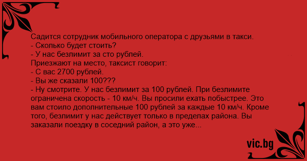 - Ну смотрите. У нас безлимит за 100 рублей. При безлимите ограничена скорость - 10 км/ч. Вы просили ехать побыстрее. Это вам стоило дополнительные 100 рублей за каждые 10 км/ч. Кроме того, безлимит у нас действует только в пределах района. Вы заказали поездку в соседний район, а это уже внутригородской роуминг. Выезд за пределы домашнего района стоит 300 рублей. Более того, во внутригородском роуминге у нас начинается оплата по километрам и мы списываем сумму сразу за 100 километров, это еще 1000. Что значит "дорого"? Обычный тариф у нас 15 руб/км, а тут получается 10. Дешевле же! Кроме того, вы разделили наше такси с друзьями. С 1 января эта услуга платная - дополнительные 200 рублей с человека. И еще 400 рублей мы сняли с вас за прослушивание музыки, т.к. садясь в такси, вы выразили согласие на получение платного музыкального контента. Так что все верно, с вас 2700!