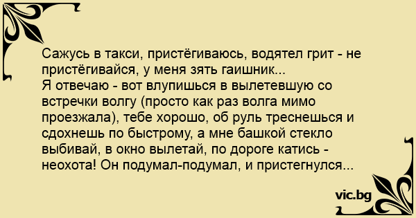 Сажусь в такси, пристёгиваюсь, водятел грит - не пристёгивайся, у меня зять гаишник...