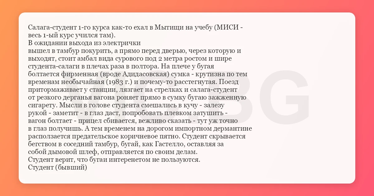 Салага-студент 1-го курса как-то ехал в Мытищи на учебу (МИСИ - весь 1-ый курс учился там). В ожидании выхода из электрички вышел в тамбур покурить, а прямо перед дверью, через которую и выходят, стоит амбал вида сурового под 2 метра ростом и шире студента-салаги в плечах раза в полтора. На плече у бугая болтается фирменная (вроде Адидасовская) сумка - крутизна по тем временам необычайная (1983 г.) и почему-то расстегнутая. Поезд притормаживает у станции, лязгает на стрелках и салага-студент от резкого дерганья вагона роняет прямо в сумку бугаю зажженную сигарету. Мысли в голове студента смешались в кучу - залезу рукой - заметит - в глаз даст, попробовать плевком затушить - вагон болтает - прицел сбивается, вежливо сказать - тут уж точно в глаз получишь. А тем временем на дорогом импортном дермантине расползается предательское коричневое пятно. Студент скрывается бегством в соседний тамбур, бугай, как Гастелло, оставляя за собой дымовой шлеф, отправляется по своим делам. Студент верит, что бугаи интеренетом не пользуются. Студент (бывший)