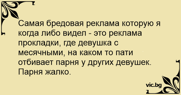 Самая бредовая реклама которую я когда либо видел - это реклама прокладки, где девушка с месячными, на каком то пати отбивает парня у других девушек. Парня жалко.