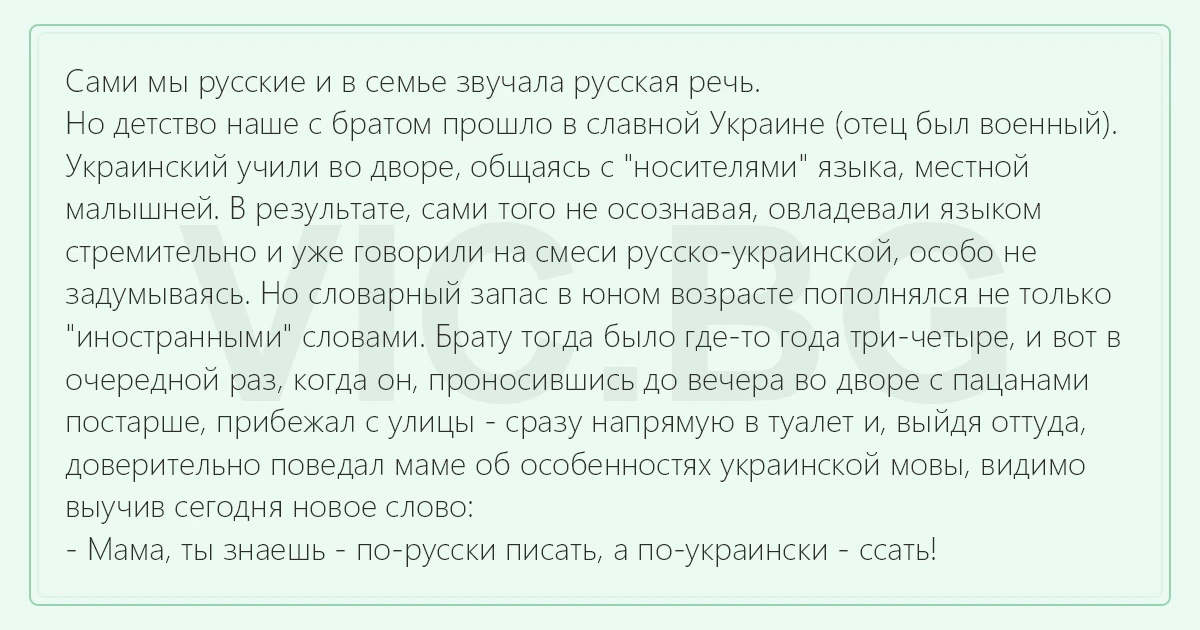 Сами мы русские и в семье звучала русская речь. Но детство наше с братом прошло в славной Украине (отец был военный). Украинский учили во дворе, общаясь с "носителями" языка, местной малышней. В результате, сами того не осознавая, овладевали языком стремительно и уже говорили на смеси русско-украинской, особо не задумываясь. Но словарный запас в юном возрасте пополнялся не только "иностранными" словами. Брату тогда было где-то года три-четыре, и вот в очередной раз, когда он, проносившись до вечера во дворе с пацанами постарше, прибежал с улицы - сразу напрямую в туалет и, выйдя оттуда, доверительно поведал маме об особенностях украинской мовы, видимо выучив сегодня новое слово: - Мама, ты знаешь - по-русски писать, а по-украински - ссать!