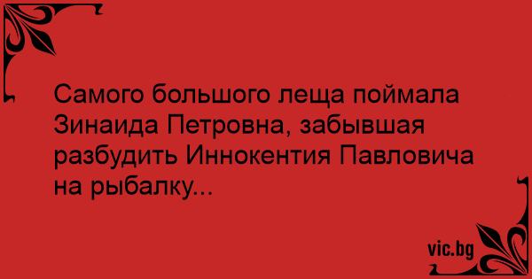 Самого большого леща поймала Зинаида Петровна, забывшая разбудить Иннокентия Павловича на рыбалку...