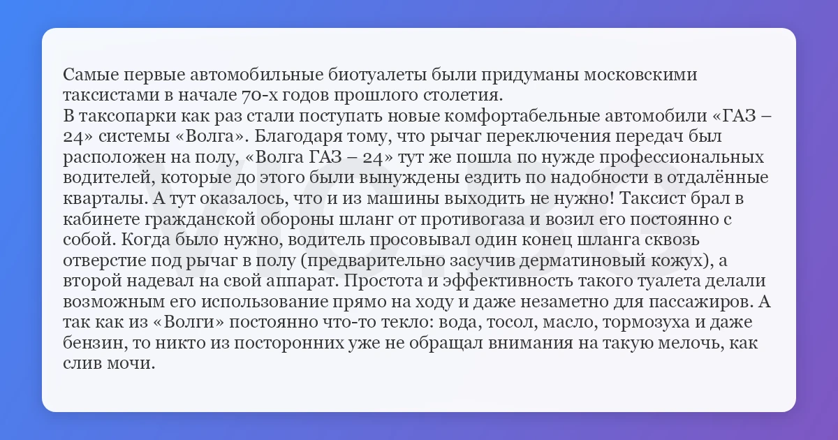 Самые первые автомобильные биотуалеты были придуманы московскими таксистами в начале 70-х годов прошлого столетия.