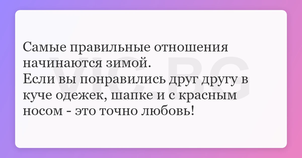 Самые правильные отношения начинаются зимой. Если вы понравились друг другу в куче одежек, шапке и с красным носом - это точно любовь!
