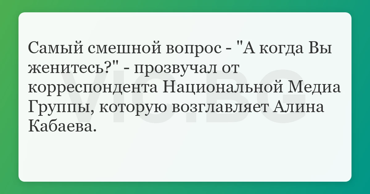Самый смешной вопрос - "А когда Вы женитесь?" - прозвучал от корреспондента Национальной Медиа Группы, которую возглавляет Алина Кабаева.