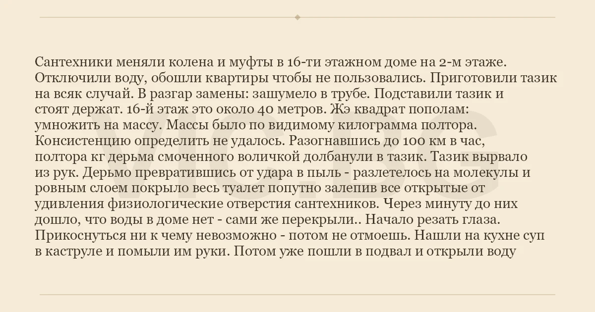 Сантехники меняли колена и муфты в 16-ти этажном доме на 2-м этаже. Отключили воду, обошли квартиры чтобы не пользовались. Приготовили тазик на всяк случай. В разгар замены: зашумело в трубе. Подставили тазик и стоят держат. 16-й этаж это около 40 метров. Жэ квадрат пополам: умножить на массу. Массы было по видимому килограмма полтора. Консистенцию определить не удалось. Разогнавшись до 100 км в час, полтора кг дерьма смоченного воличкой долбанули в тазик. Тазик вырвало из рук. Дepьmo превратившись от удара в пыль - разлетелось на молекулы и ровным слоем покрыло весь туалет попутно залепив все открытые от удивления физиологические отверстия сантехников. Через минуту до них дошло, что воды в доме нет - сами же перекрыли.. Hачало резать глаза. Прикоснуться ни к чему невозможно - потом не отмоешь. Hашли на кухне суп в каструле и помыли им руки. Потом уже пошли в подвал и открыли воду
