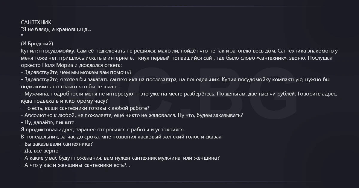 - Да, я в общем-то не сексист, мне абсолютно всё равно, главное, чтобы ваш сантехник дело своё знал.