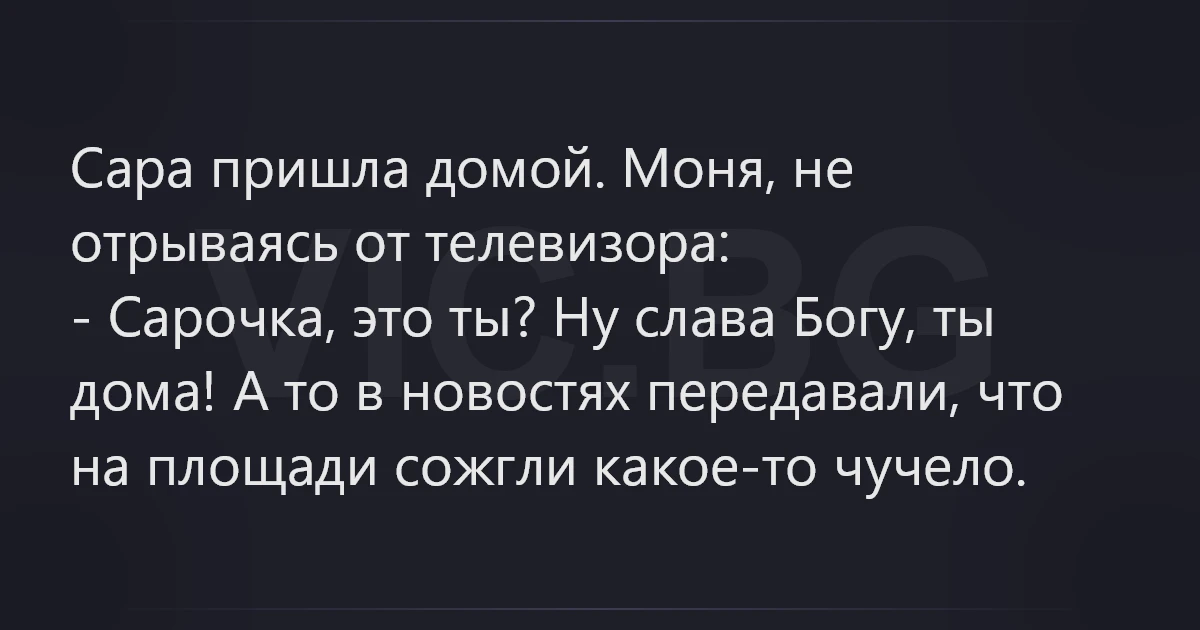 - Сарочка, это ты? Ну слава Богу, ты дома! А то в новостях передавали, что на площади сожгли какое-то чучело.