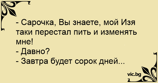 - Сарочка, Вы знаете, мой Изя таки перестал пить и изменять мне! - Давно? - Завтра будет сорок дней...