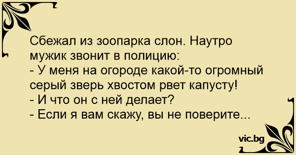 Із зоопарку втік слон. Лунає дзвінок в поліцію: — У мене на городі велика миша рве хвостом капусту. — І що вона з нею робить далі? — Ви не повірите...