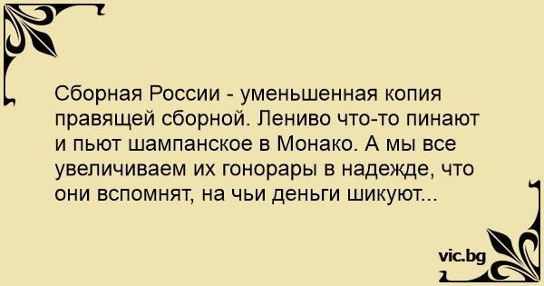 Сборная России - уменьшенная копия правящей сборной. Лениво что-то пинают и пьют шампанское в Монако. А мы все увеличиваем их гонорары в надежде, что они вспомнят, на чьи деньги шикуют...