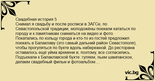 Покатались по кольцу города и кто-то из гостей предложил поехать в Балаклаву (это самый дальний район Севастополя), чтобы прогуляться по бухте вдоль набережной. До ресторана оставалось ещё уйма времени и, поэтому, все согласились. Подъехали к Балаклавской бухте: гуляем, пьем шампанское, делаем свадебный фильм и фотоальбом. Там, на набережной, есть несколько деревянных пирсов у которых стоят рыбацкие лодки и катера. На один из таких пирсов мы и зашли сделать красивую фотосессию на фоне вечереющего моря. Невеста крутится в развевающемся платье, мы с фотографом снимаем, жених со свидетелем стоя позади нас и курят. Вдруг, из одной лодки вылетает поддатый рыбак, хватает невесту на руки и бежит с ней к краю причала (типа, он украл невесту и ему должны дать за это пузырь водки-выкуп!), где его уже ждут приятели на шлюпке, которые уже тянут руки, чтобы принять груз. Подбегая к краю причала, неудачник спотыкается о швартовы и.... вместе с невестой летит в воду! Свадьба стоит в шоке, никто не двинулся с места, потому-что всё произошло за какие-то несколько секунд тем более, никто в процессе фотосессии не обратил внимания на готовящийся теракт. Рыбаки быстро поднимают с воды своего друга и невесту, возвращают её на пирс и резко отходят к середине бухты. Подлетают свидетель и жених и на матерном жаргоне объясняются с воришками. Те просят прощения и говорят, что готовы сами купить пузырь за неудачный проступок. Стрит ругань, мат и гам на всю Балаклавскую бухту! Вдруг раздаётся дикий женский хохот. Все оборачиваются на невесту, думая, что у неё истерика. Девушка прекращает смеяться, подходит к нам с фотографом и спрашивает: