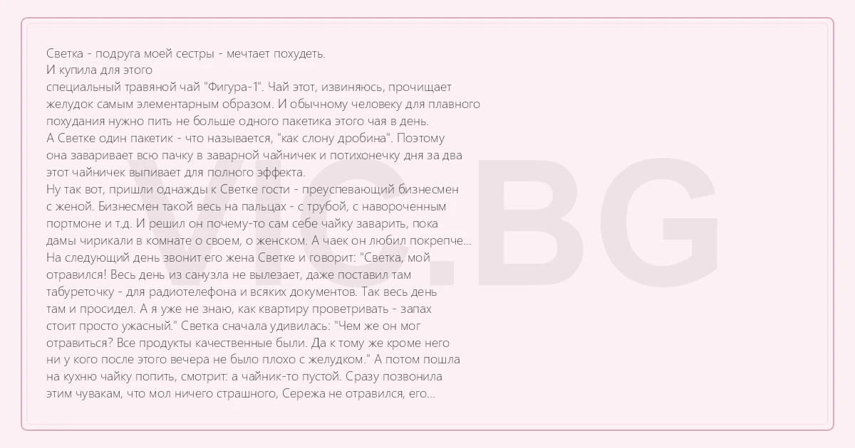 Светка - подруга моей сестры - мечтает похудеть. И купила для этого специальный травяной чай "Фигура-1". Чай этот, извиняюсь, прочищает желудок самым элементарным образом. И обычному человеку для плавного похудания нужно пить не больше одного пакетика этого чая в день. А Светке один пакетик - что называется, "как слону дробина". Поэтому она заваривает всю пачку в заварной чайничек и потихонечку дня за два этот чайничек выпивает для полного эффекта. Ну так вот, пришли однажды к Светке гости - преуспевающий бизнесмен с женой. Бизнесмен такой весь на пальцах - с трубой, с навороченным портмоне и т.д. И решил он почему-то сам себе чайку заварить, пока дамы чирикали в комнате о своем, о женском. А чаек он любил покрепче... На следующий день звонит его жена Светке и говорит: "Светка, мой отравился! Весь день из санузла не вылезает, даже поставил там табуреточку - для радиотелефона и всяких документов. Так весь день там и просидел. А я уже не знаю, как квартиру проветривать - запах стоит просто ужасный." Светка сначала удивилась: "Чем же он мог отравиться? Все продукты качественные были. Да к тому же кроме него ни у кого после этого вечера не было плохо с желудком." А потом пошла на кухню чайку попить, смотрит: а чайник-то пустой. Сразу позвонила этим чувакам, что мол ничего страшного, Сережа не отравился, его прочистит капитально и все. За три дня Сережа похудел на 12 кг. Когда ему стало получше, они с женой уехали на неделю на природу - чтобы квартира успела проветриться. А примерно через месяц зашли опять в гости к Светке. А Светка ведь уже про ту историю и думать забыла. И совершенно от чистого сердца говорит: "Сереженька, хочешь чайку?.." Что последовало дальше - объяснять не надо. Русский язык ведь так богат...