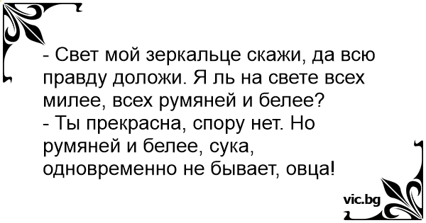- Свет мой зеркальце скажи, да всю правду доложи. Я ль на свете всех милее, всех румяней и белее?