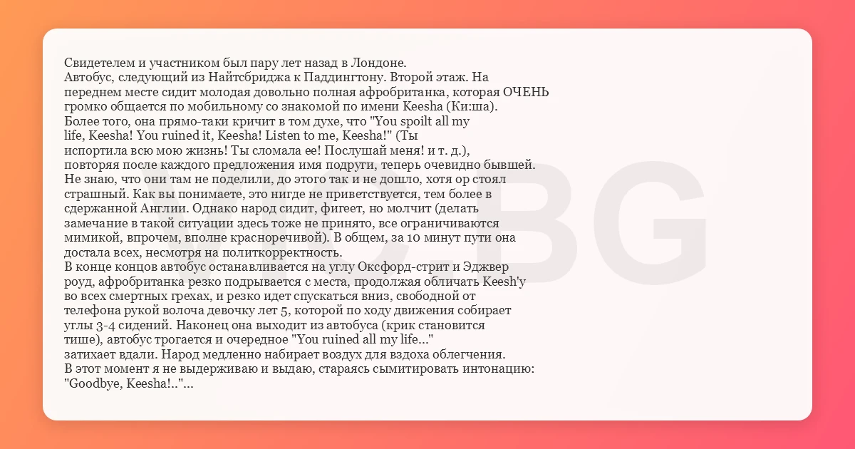 громко общается по мобильному со знакомой по имени Keesha (Ки:ша).