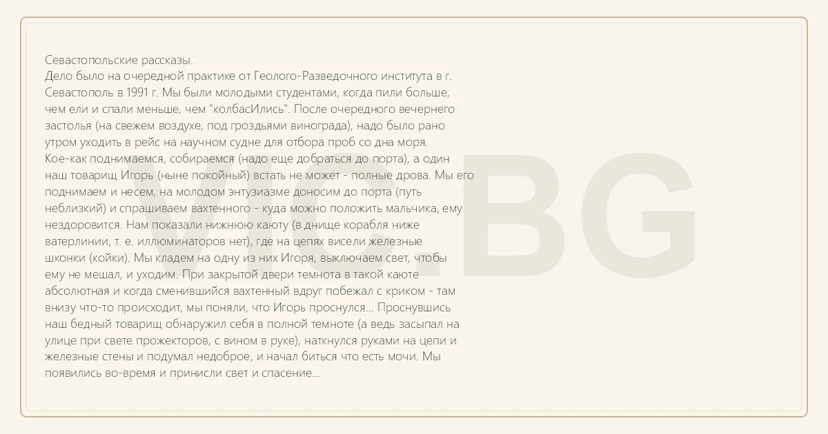 Севастопольские рассказы. Дело было на очередной практике от Геолого-Разведочного института в г. Севастополь в 1991 г. Мы были молодыми студентами, когда пили больше, чем ели и спали меньше, чем "колбасИлись". После очередного вечернего застолья (на свежем воздухе, под гроздьями винограда), надо было рано утром уходить в рейс на научном судне для отбора проб со дна моря. Кое-как поднимаемся, собираемся (надо еще добраться до порта), а один наш товарищ Игорь (ныне покойный) встать не может - полные дрова. Мы его поднимаем и несем, на молодом энтузиазме доносим до порта (путь неблизкий) и спрашиваем вахтенного - куда можно положить мальчика, ему нездоровится. Нам показали нижнюю каюту (в днище корабля ниже ватерлинии, т. е. иллюминаторов нет), где на цепях висели железные шконки (койки). Мы кладем на одну из них Игоря, выключаем свет, чтобы ему не мешал, и уходим. При закрытой двери темнота в такой каюте абсолютная и когда сменившийся вахтенный вдруг побежал с криком - там внизу что-то происходит, мы поняли, что Игорь проснулся... Проснувшись наш бедный товарищ обнаружил себя в полной темноте (а ведь засыпал на улице при свете прожекторов, с вином в руке), наткнулся руками на цепи и железные стены и подумал недоброе, и начал биться что есть мочи. Мы появились во-время и принисли свет и спасение...