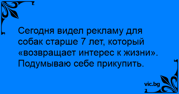 Днес видях реклама за кучета над 7 години, която „възвръща интереса към живота“. Мисля да си купя такава.