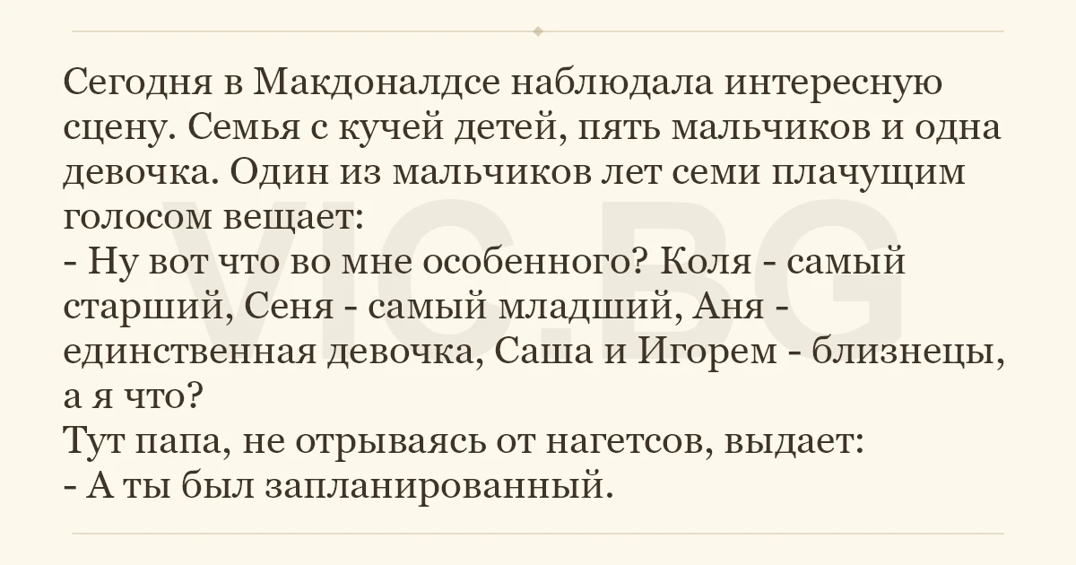 Сегодня в Макдоналдсе наблюдала интересную сцену. Семья с кучей детей, пять мальчиков и одна девочка. Один из мальчиков лет семи плачущим голосом вещает: - Ну вот что во мне особенного? Коля - самый старший, Сеня - самый младший, Аня - единственная девочка, Саша и Игорем - близнецы, а я что? Тут папа, не отрываясь от нагетсов, выдает: - А ты был запланированный.