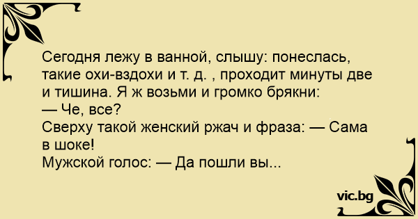 Сегодня лежу в ванной, слышу: понеслась, такие охи-вздохи и т. д. , проходит минуты две и тишина. Я ж возьми и громко брякни: