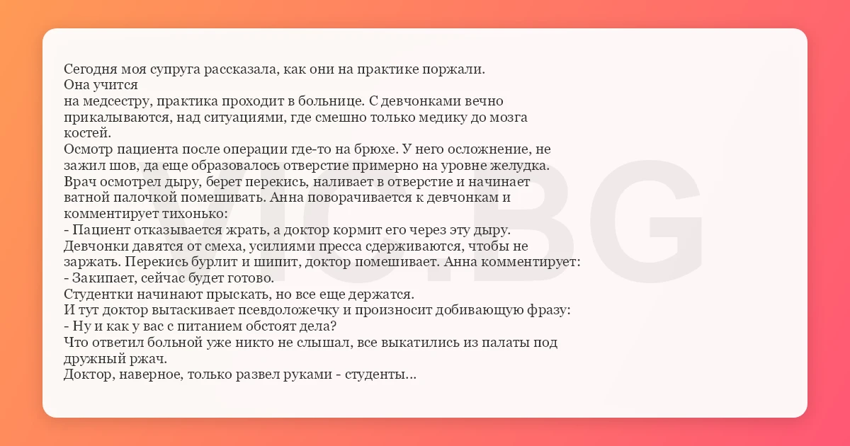 Сегодня моя супруга рассказала, как они на практике поржали. Она учится на медсестру, практика проходит в больнице. С девчонками вечно прикалываются, над ситуациями, где смешно только медику до мозга костей. Осмотр пациента после операции где-то на брюхе. У него осложнение, не зажил шов, да еще образовалось отверстие примерно на уровне желудка. Врач осмотрел дыру, берет перекись, наливает в отверстие и начинает ватной палочкой помешивать. Анна поворачивается к девчонкам и комментирует тихонько: - Пациент отказывается жрать, а доктор кормит его через эту дыру. Девчонки давятся от смеха, усилиями пресса сдерживаются, чтобы не заржать. Перекись бурлит и шипит, доктор помешивает. Анна комментирует: - Закипает, сейчас будет готово. Студентки начинают прыскать, но все еще держатся. И тут доктор вытаскивает псевдоложечку и произносит добивающую фразу: - Ну и как у вас с питанием обстоят дела? Что ответил больной уже никто не слышал, все выкатились из палаты под дружный ржач. Доктор, наверное, только развел руками - студенты...