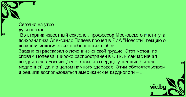 Заодно он рассказал о лечении женской грудью. Этот метод, по словам Полеева, широко распространен в США и сейчас начал внедряться в России. Дело в том, что сердце у женщин бьется медленней, да и в целом намного здоровее. Этим обстоятельством и решили воспользоваться американские кардиологи – они научно доказали, что если к мужчине с тахикардией прислонить женщину с нормальным сердечным ритмом, то ритм мужского сердца замедляется.