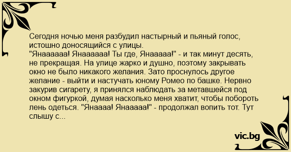 "Янаааааа! Янаааааа! Ты где, Янааааа!" - и так минут десять, не прекращая. На улице жарко и душно, поэтому закрывать окно не было никакого желания. Зато проснулось другое желание - выйти и настучать юному Ромео по башке. Нервно закурив сигарету, я принялся наблюдать за метавшейся под окном фигуркой, думая насколько меня хватит, чтобы побороть лень одеться. "Янаааа! Янааааа!" - продолжал вопить тот. Тут слышу с соседнего окна тонкий голосок: "Чего, милый?". "Яна, я люблю тебя!", - его голос заметно приободрился. "И я тебя, милый! А теперь иди домой спать, завтра позвоню тебе". "Хорошоооо!" - с этими словами фигурка, радостной припрыжкой, стала быстро удаляться от дома.