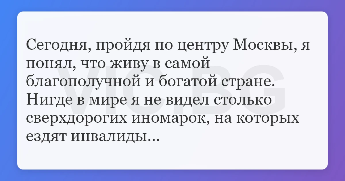 Сегодня, пройдя по центру Москвы, я понял, что живу в самой благополучной и богатой стране. Нигде в мире я не видел столько сверхдорогих иномарок, на которых ездят инвалиды...